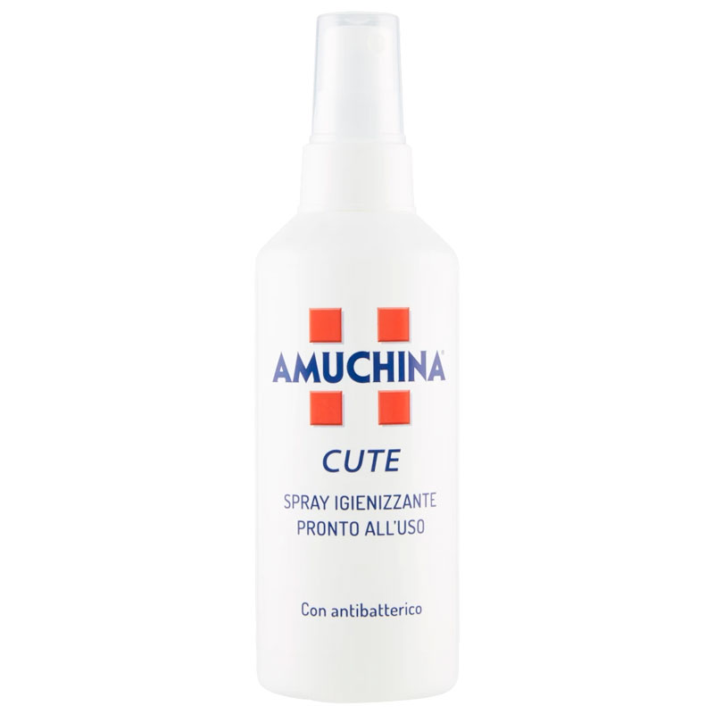 Amuchina Cute Spray disinfettante con antibatterico, a base di ipoclorito di sodio, esercita una rapida e profonda azione disinfettante della cute e delle mani eliminando virus e batteri dalla pelle. Amuchina Cute si utilizza senza acqua e lascia una sensazione di pelle pulita e igienizzata.