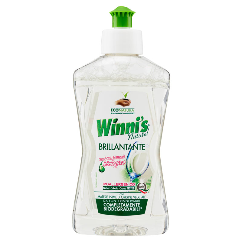- 2 pezzi WINNI’S Brillantante, con aceto naturale e al limone, in confezioni da 250ml. – Infatti nella fase finale del lavaggio, la lavastoviglie prevede un risciacquo con acqua ad alta temperatura per farla evaporare più in fretta, ma può comunque rimanere un residuo d’acqua che provoca un deposito di calcare sulle nostre stoviglie. È proprio qui che entra in gioco il brillantante Winni’s: favorisce la formazione di uno strato uniforme di acqua sulla superficie delle stoviglie che si asciugano perfettamente senza accumulare calcare.