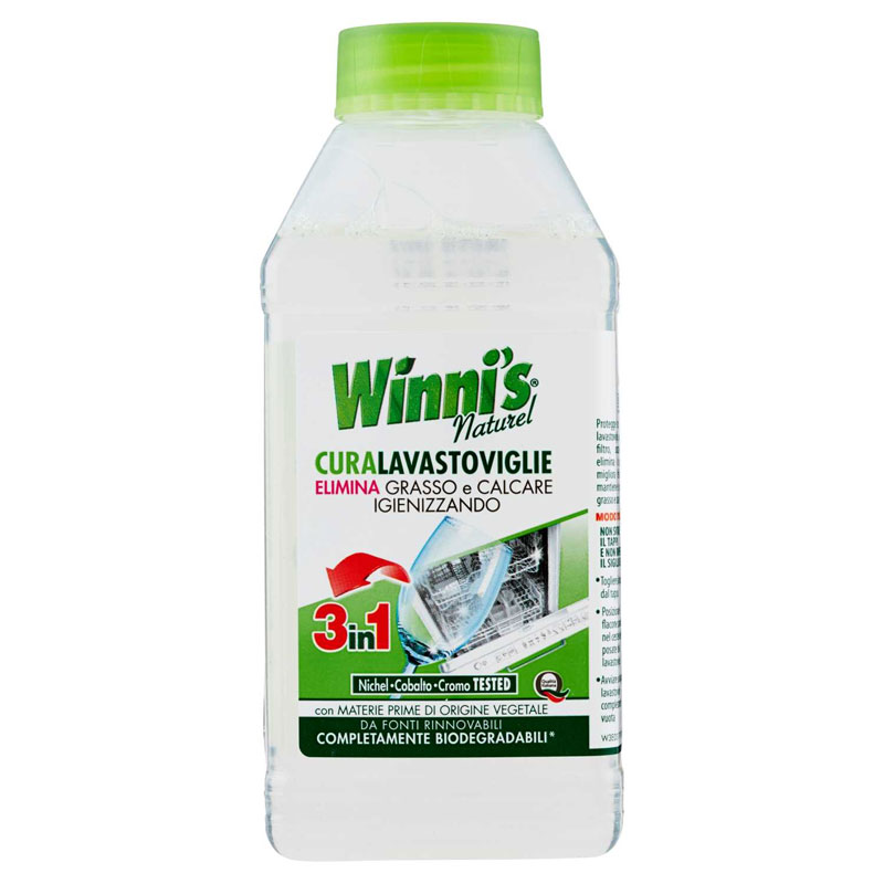 - 1 pezzo WINNI’S Curalavastoviglie, in confezione da 250ml. – Winni’s Curalavastoviglie è studiato proprio per proteggere le parti interne del nostro elettrodomestico, anche quelle più nascoste come il filtro, lo spruzzatore e le guarnizioni. Usato regolarmente migliora l’efficacia di lavaggio perché mantiene le parti meccaniche libere da grasso e calcare.