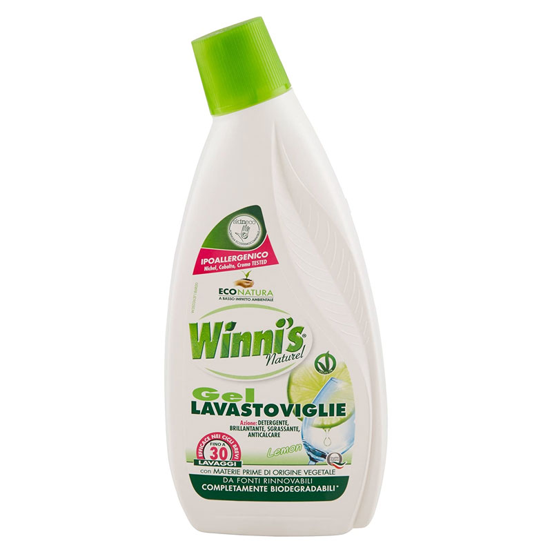 - 1 pezzo WINNI’S Gel Lavastoviglie Lemon, in confezione da 600ml. – Winni’s Gel Lavastoviglie nasce da un’attenta selezione di materie prime a basso impatto ambientale e proveniente da fonti rinnovabili ed è arricchita di enzimi per pulire e sgrassare a fondo. I suoi componenti specifici lavaggio dopo lavaggio rendono le stoviglie più brillanti e aiutano a mantenere più pulita la lavastoviglie.