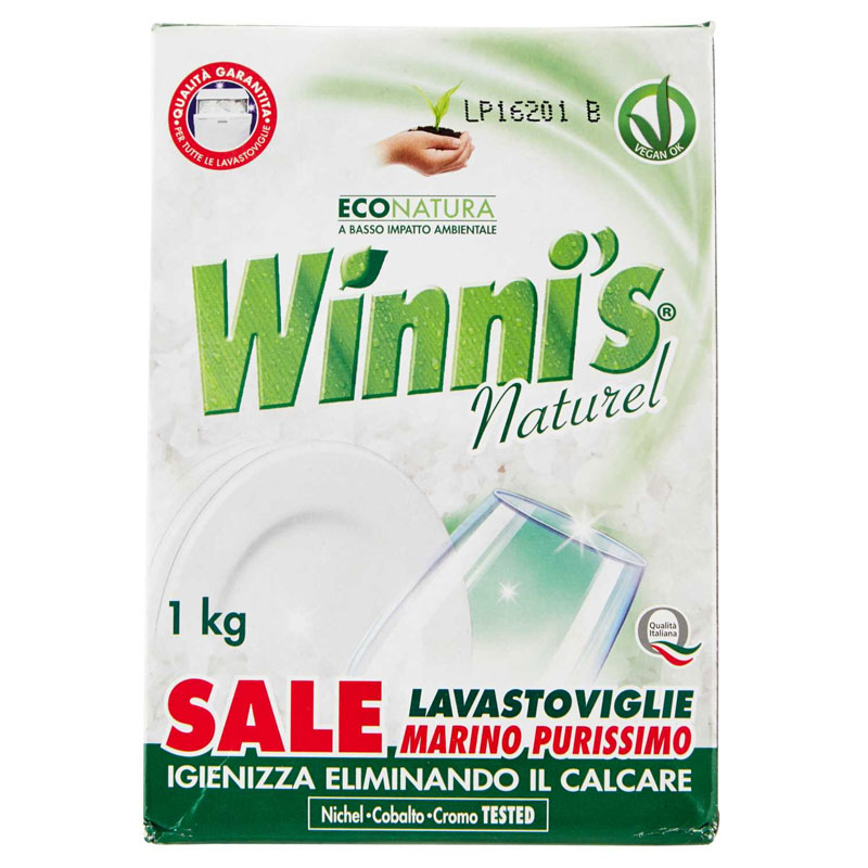 - 3 pezzi WINNI’S Sale Lavastoviglie, in confezioni da 1kg. – L’addolcitore deve essere costantemente rigenerato mediante l’aggiunta di sale puro. Winni’s sale marino purissimo è specifico per la rigenerazione delle resine a scambio ionico utilizzate dalle lavastoviglie per contrastare il deposito dei Sali minerali sulle stoviglie.