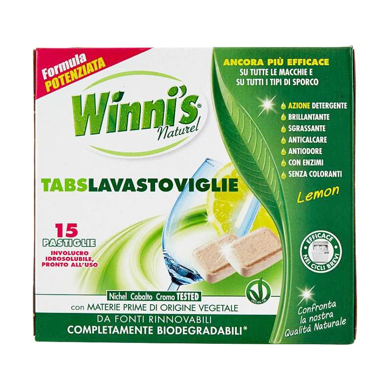 - 3 pezzi WINNI’S Tabs Lavastoviglie Lemon in confezioni da 15 pezzi, per un totale di 45 tabs. – Grazie alla formula ricca di materie prime di origine vegetale, le pastiglie Winni’s lasciano le stoviglie brillanti e senza tracce; l’ossigeno attivo e gli enzimi senza coloranti sono efficaci contro unto e sporco ostinato, assicurano un pulito perfetto e la massima igiene su piatti e stoviglie. Efficaci già a basse temperature e anche nei cicli brevi, hanno un involucro idrosolubile e sono già pronte all’uso.