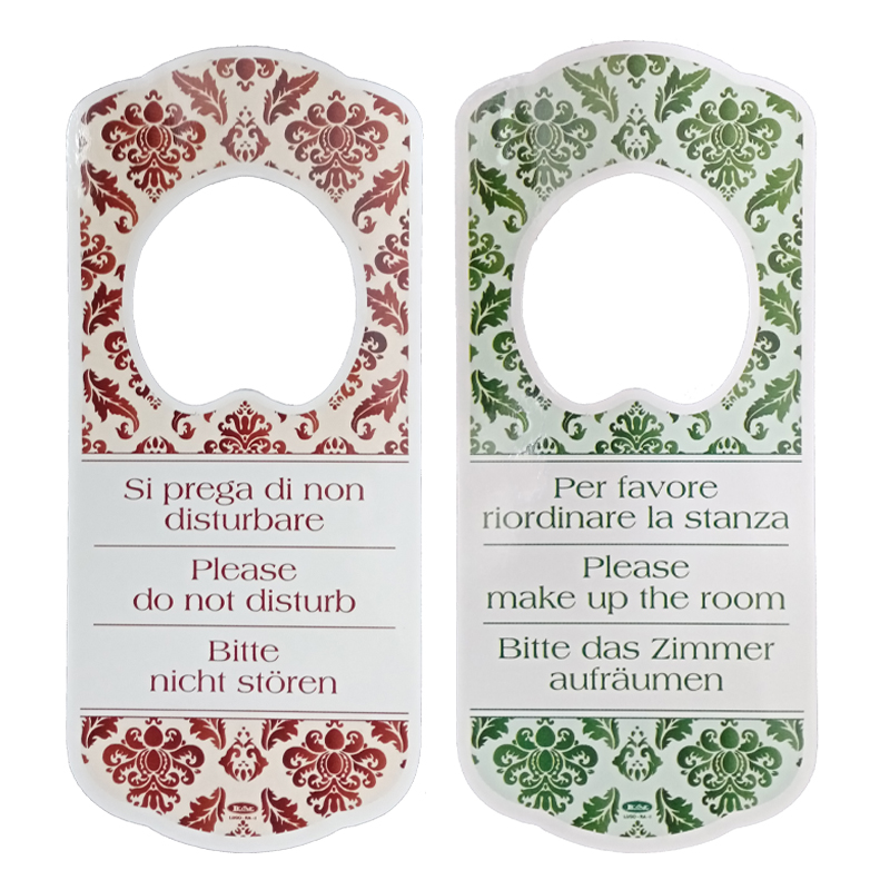 - Con testo italiano, inglese e tedesco. “Per favore riordinare la stanza” – “Si prega di non disturbare”.