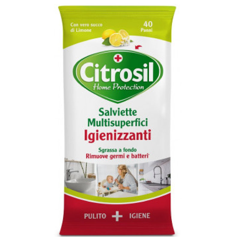 CITROSIL Home Protection Salviette Multisuperfici Igienizzanti al LIMONE, in confezione da 40 salviette.
