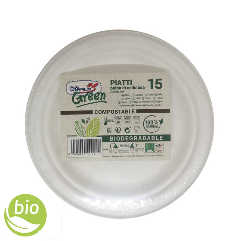 DOPLA GREEN Piatti Medi Rotondi Ø 22cm in Polpa di Cellulosa Biodegradabili, confezione da 15 pezzi.