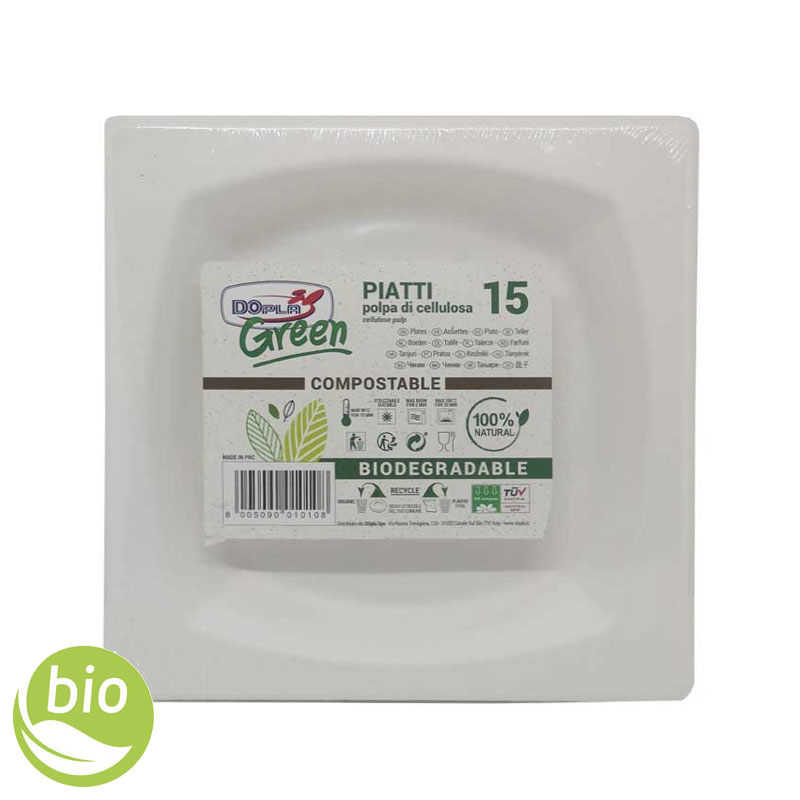 DOPLA GREEN Piatti Piccoli Quadrati 17cm in Polpa di Cellulosa Biodegradabili, confezione da 15 pezzi.
