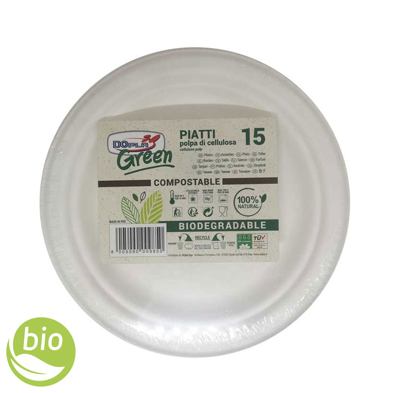 DOPLA GREEN Piatti Piccoli Rotondi Ø 17cm in Polpa di Cellulosa Biodegradabili, confezione da 15 pezzi.