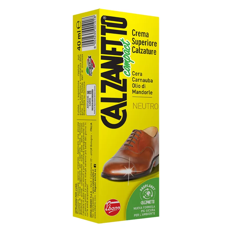 Calzanetto crema superiore per calzature colorata neutro ha una formula base del 1926 che, di quell’epoca, conserva la più parte di ingredienti. La sapiente miscela di cere pregiate, solventi, pigmenti, ed acqua ne fa un prodotto di ottima qualità, facile applicazione, alto nutrimento, grande lucentezza, buon potere ricolorante e discreto potere idrorepellente.