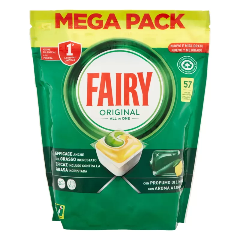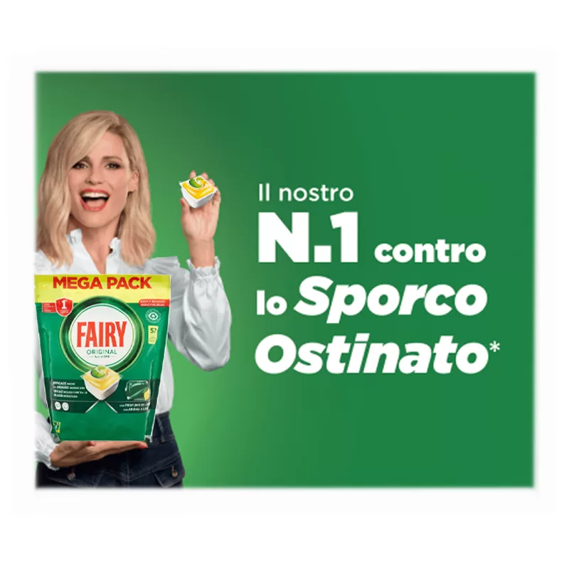 Da inserire semplicemente nella lavastoviglie, Fairy ha un’efficace azione pulente fin dal 1° lavaggio.