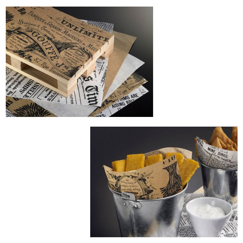 La carta antigrasso può essere utilizzata anche per avvolgere alimenti fritti o come base d’appoggio per la presentazione, su mini pallet in legno, di aperitivi, antipasti, finger food ed happy hour. Si abbina ottimamente con focacce, piadine, tigelle, panini, hamburger gourmet e fritture di pesce, esaltando la genuinità dei prodotti.