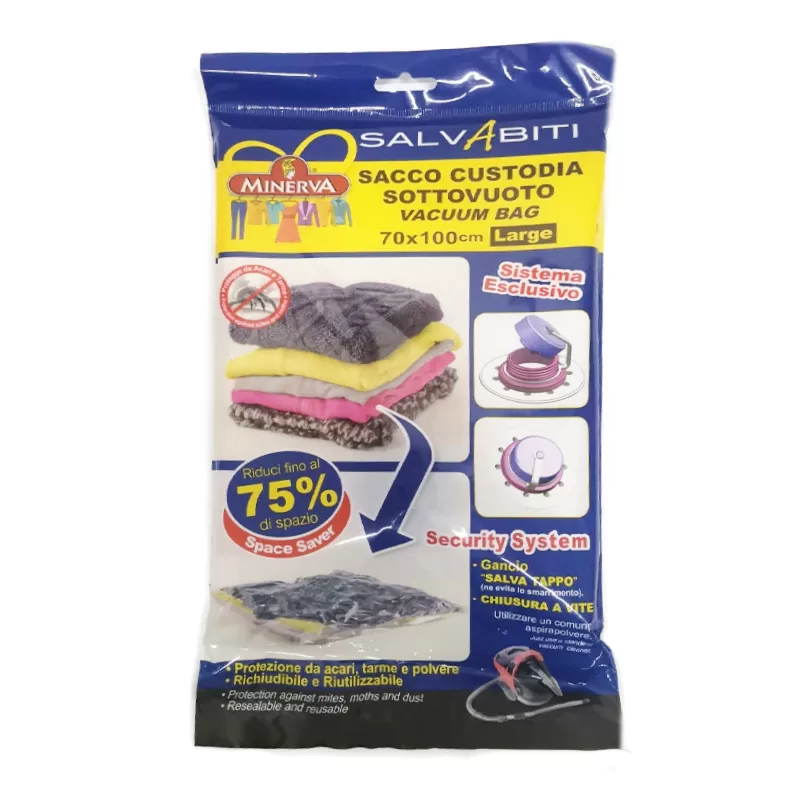 La sacca salva-abiti sottovuoto, è lo strumento ideale per conservare al meglio i vostri capi, coperte e piumoni riducendo fino al 75% l’ingombro nell’armadio, proteggendoli inoltre da cattivi odori, umidità, acari, tarme e polvere.