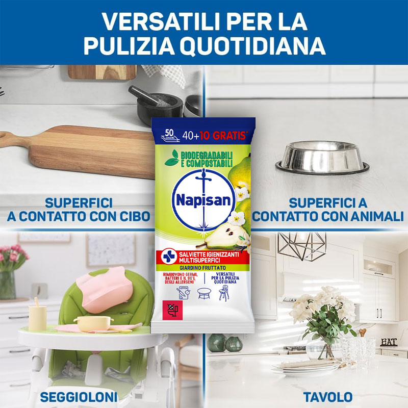 Le salviette igienizzanti Napisan sono pratiche salviette detergenti e antibatteriche, ideali per pulire e igienizzare in un solo gesto. Sono già pronte all’uso e non richiedono risciacquo nella maggior parte dei casi.