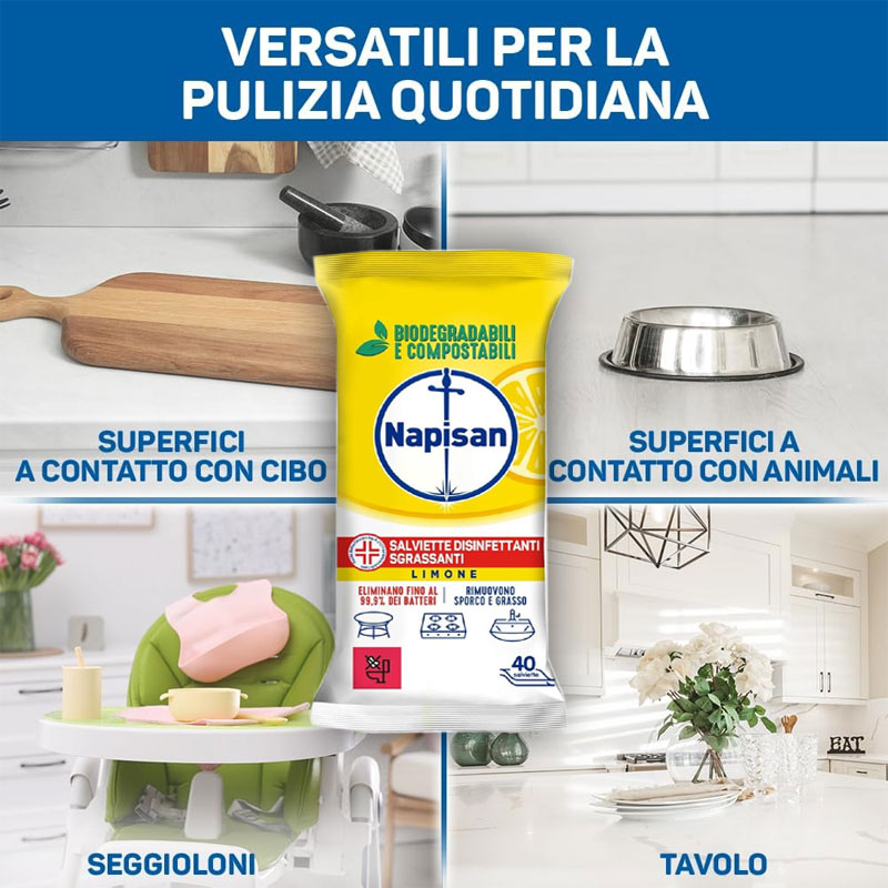 Le salviette igienizzanti al limone Napisan sono pratiche salviette detergenti e antibatteriche, ideali per pulire e igienizzare in un solo gesto. Sono già pronte all’uso e non richiedono risciacquo nella maggior parte dei casi.