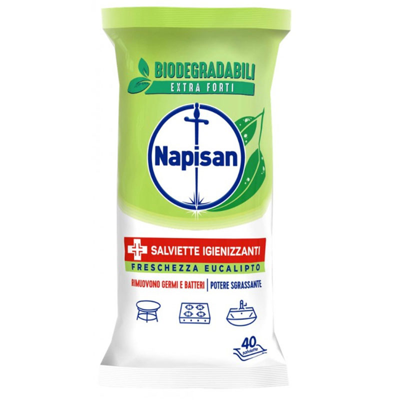 NAPISAN Salviette Biodegradabili Multisuperfici Igienizzanti all’Eucalipto, confezione da 40 pezzi.