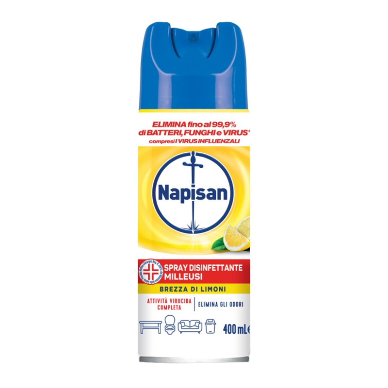 Napisan Spray Disinfettante Milleusi con un profumo brezza di limoni indicato per superfici e tessuti d’arredo può essere utilizzato su centinaia di superfici quali quelle del bagno e della cucina, divani, materassi, cuscini, scarpe e solette. Facile da usare: non è necessario asciugare con un panno.