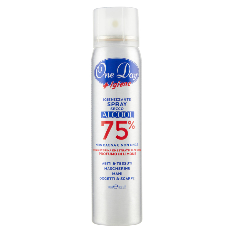 ONE DAY +Igiene Igienizzante Spray secco con ALCOOL 75%, in confezione da 100 ml.