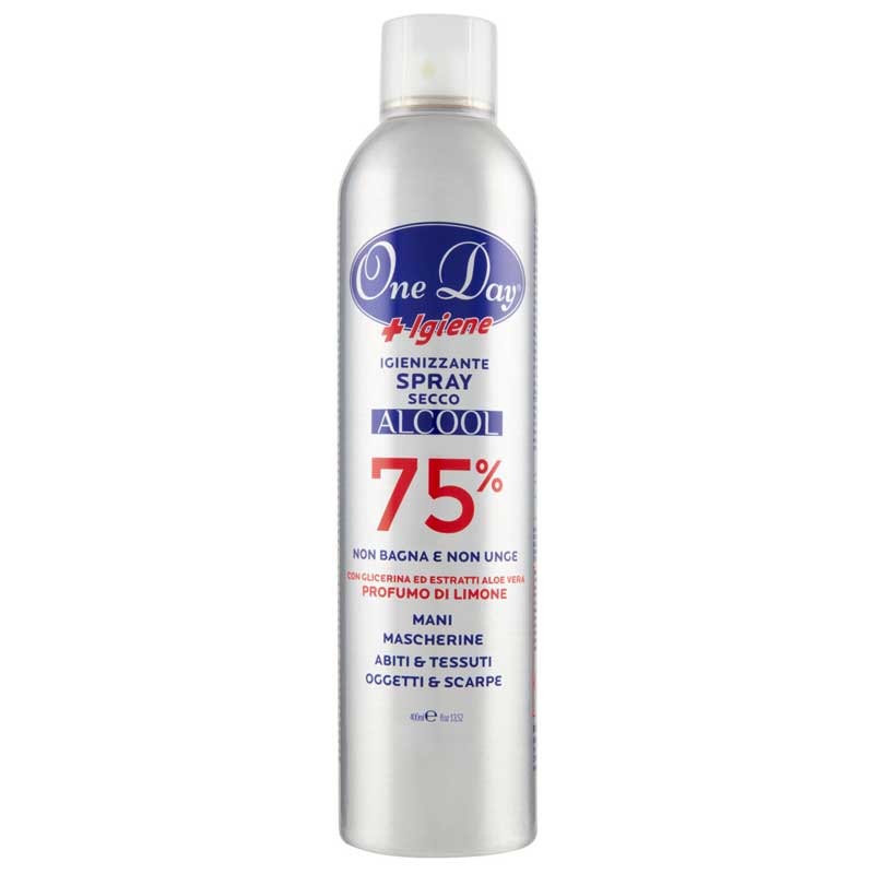 ONE DAY +Igiene Igienizzante Spray secco con ALCOOL 75%, in confezione da 400 ml.