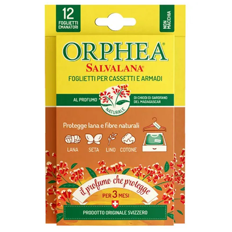 ORPHEA salvalana FOGLIETTI PER CASSETTI E ARMADI al profumo di chiodi di garofano del Madagascar, in confezione da 12 pezzi.