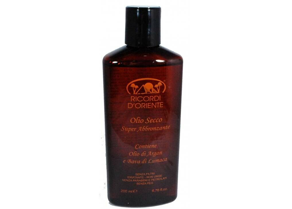 Ricordi d’Oriente olio seccp superabbronzante senza filtri all’Olio di Argan e Bava di Lumaca.Quest’olio è idradante,non unge,senza parabeni,senza petrolati e senza peg.Ricco di vitamina E,olio di calendula,di nocciolo,di carota,di argan e mallo di noce,arricchito con bava di lumaca.Nutre e idrata la pelle senza ungerla.Per avere un’abbronzatura rapida,pelle levigata e satinata.Può anche essere usato per proteggere i capelli dalla salsedine e dal sole.