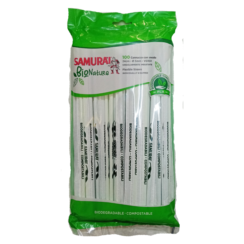 Le cannucce SAMURAI BIONATURE in PLA sono prodotte con materie prime rinnovabili. Sono biodegradabili e compostabili. Ideali per tutte le bevande, per una temperatura massima di 40°.