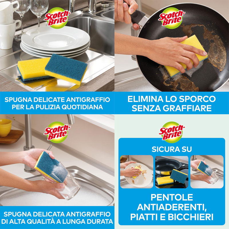 - Lato abrasivo delicato: studiato appositamente per agire contro lo sporco senza essere aggressivo, quindi adatto a materiali come vetro, ceramica, acciaio inox e superfici antiaderenti.