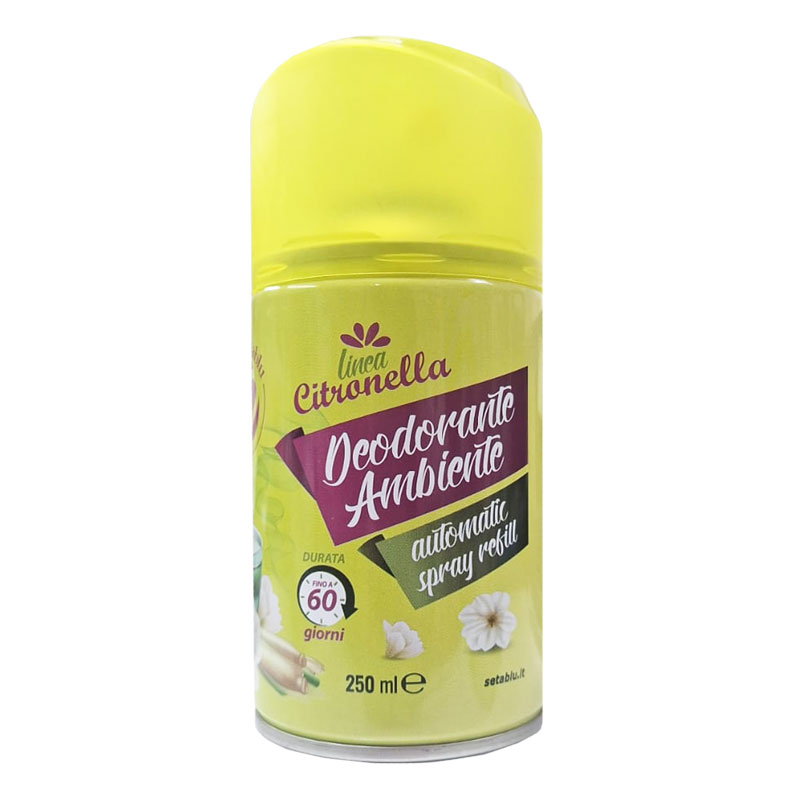 Le bombolette di deodorante ambiente alla citronella della linea Setablu sono compatibili con diffusori automatici per bombolette spray da 250ml, come quelli utilizzati comunemente per ambienti domestici o commerciali.