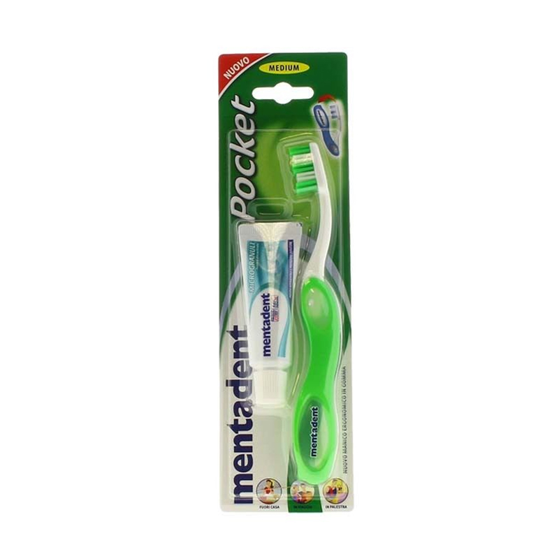 MENTADENT POCKET spazzolino manuale medio + dentifricio microgranuli -3pz.
