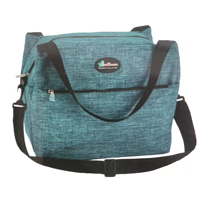 Borsa termica dal design classico dotata di pratiche maniglie, tracolla regolabile.