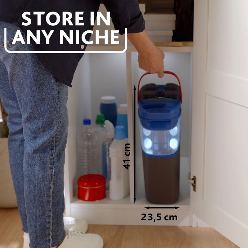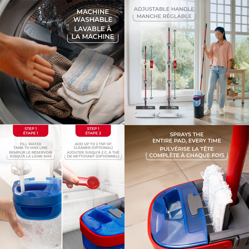Dotato di getti che rilasciano acqua pulita su tutta la superficie del panno, il sistema si aziona con una sola mano bagnando il panno e inserendolo poi nell’apposito strizzatore che consente di grattare via lo sporco senza affaticarsi.