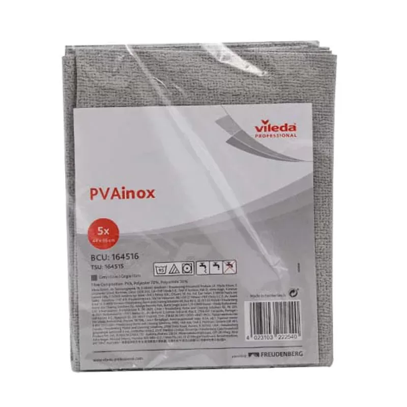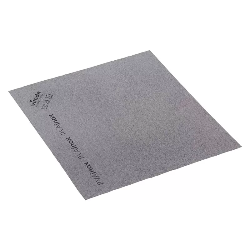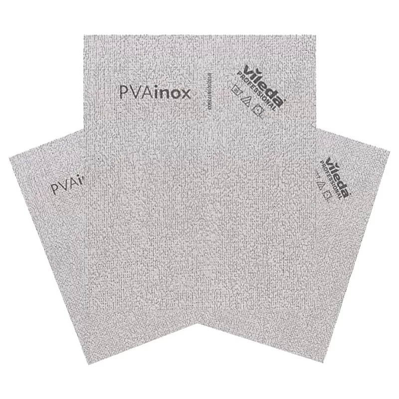 PVAinox di Vileda è un panno in microfibra tessuta con uno speciale rivestimento in PVA (100% alcol polivinilico) che lo rende ideale per la pulizia delle superfici compatte e brillanti in acciaio inox, ma anche per la pulizia di vetri, specchi e mobili.